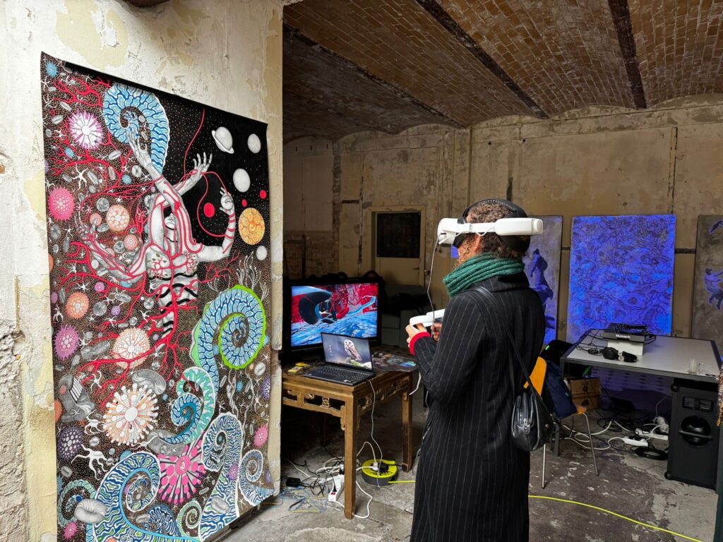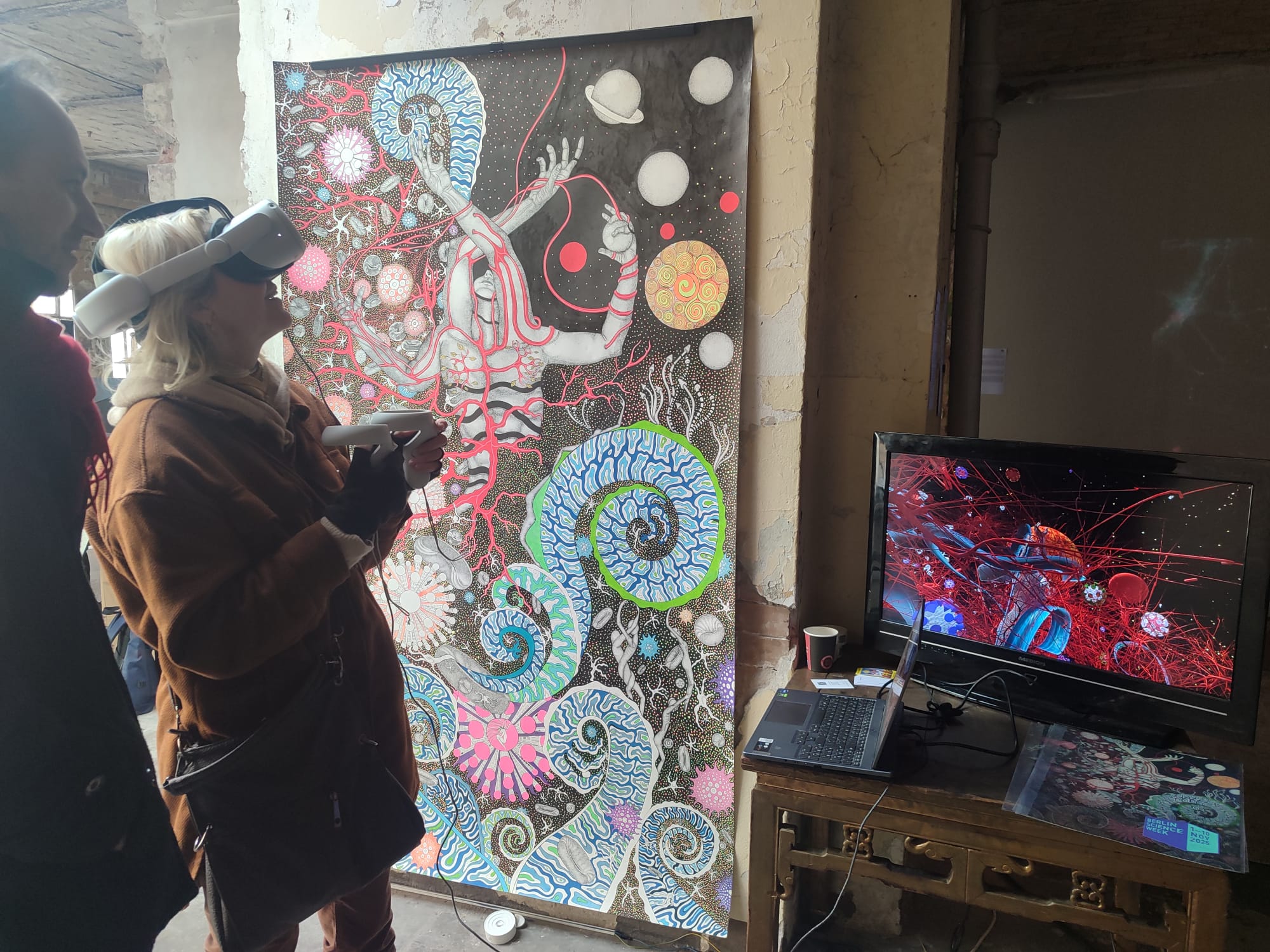 Hemathurgy by Ala Leresteux and Jeremy Leresteux is an immersive VR project inspired by posthumanism research. Artists explore how technology, myth, and biology can merge to expand the boundaries of human perception. Experience takes participants on a meditative journey into the inner landscapes of their microbiome. Beginning in front of a virtual painting, viewers cross a threshold into a surreal animated world where every element is interactive. Touching a cell may trigger a sound or a story. At the centre stands a mythic figure, drawn from the canvas and pulsing with life, inviting engagement, play, and reflection.